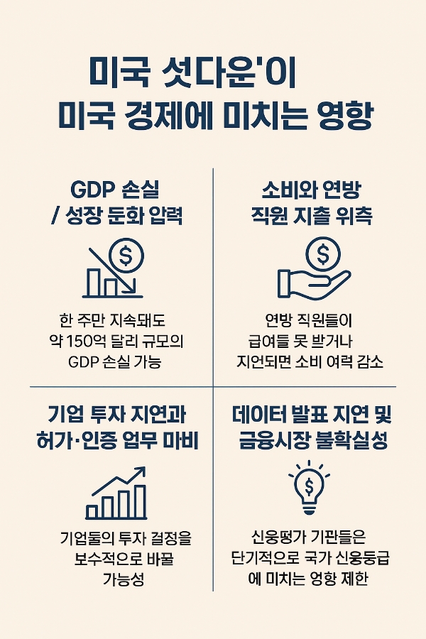 셧다운은 단기적으로 성장률과 소비를 억제하고, 기업 투자와 허가 업무를 위축시키며, 시장의 불확실성을 증폭시킨다.