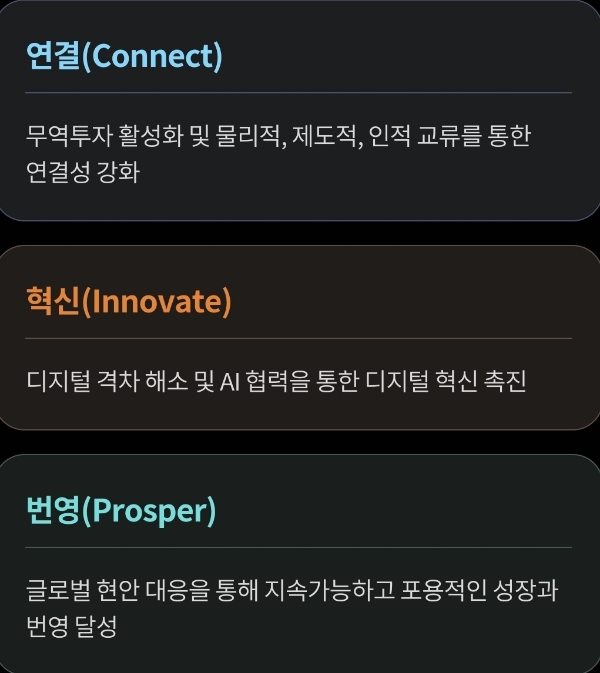 APEC 정상회의의 핵심 주제는 “Connect, Innovate, Prosper(연결·혁신·번영)”이다.  이 세 축은 한국이 내세우는 전략적 비전과도 궤를 같이 한다.