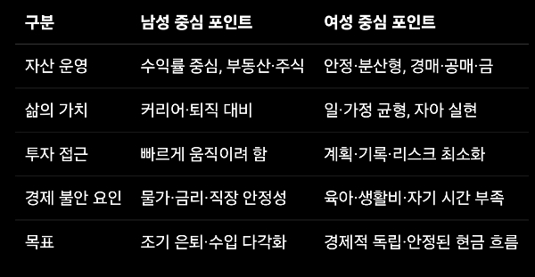 ◀️ 여성: 개인연금, 월세 수입, 시세차익형 자산 관심