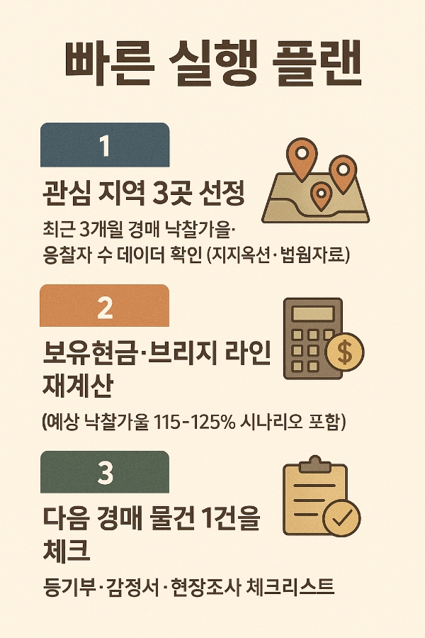 ✅️ 다음 경매 물건 1건을 택해 등기부·감정서·현장조사 체크리스트로 점검 — 권리문제만 클리어되면 입찰 시나리오(최대입찰가·목표수익률) 확정.