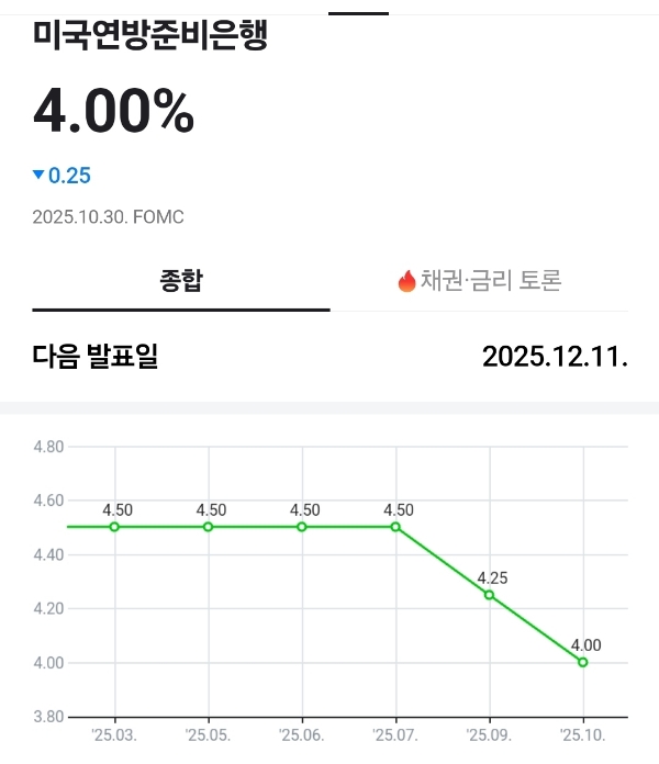 미국 연방준비은행이 기준금리를 **4.25% → 4.00%**로 인하.
