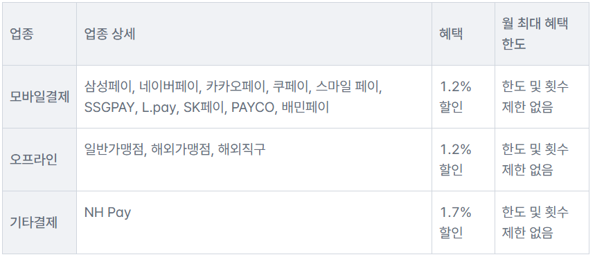 농협 지금 더 페이 카드는 전월실적과할인 한도 제한 모두 없이 국내외 모든 가맹점 1% 기본할인 제공해주는 카드입니다. 네이버, 카카오, 쿠페이, 삼성페이를 포함한 모든 온라인 간편결제를 사용할 때 마다 1.2% 기본 할인을 제공해주는데, 이렇게 받은 할인에 대해서는 실적제외가 되지 않아 평소 간편결제를 즐겨 쓰시는 분들이라면 추천립니다. 온라인에서 간편결제 1.2%, 오프라인에서는 모든 가맹점 1% 할인을 받을 수 있으니 거의 모든 결제건에 대해 할인 받을 수 있는 셈이예요. 참고로 NH페이로 결제시 1.7% 할인으로 더 높은 혜택을 받을 수 있으니 농협카드를 찾고 계시는 분들께도 추천드려요.