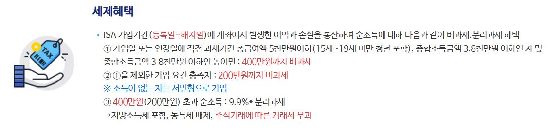 일반적으로 이자소득이나 배당소득이 발생하면 15.4%의 세금을 떼는데, ISA 계좌는 200만원의 수익이 나와도 비과세가 되고, 200만원을 넘는 수익에 대해서도 9.9% 낮은 세율로 과세한다.