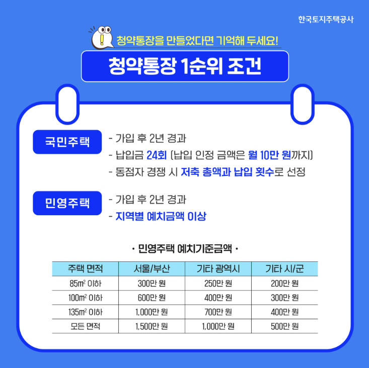 투기과열지구, 청약과열 지역은 2년(24회) 이상이 필요하며, 매월 약정 납입일에 월 납입금을 연체 없이 납입해야 한다.