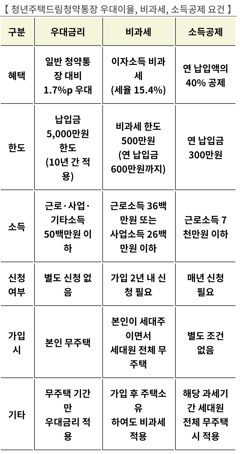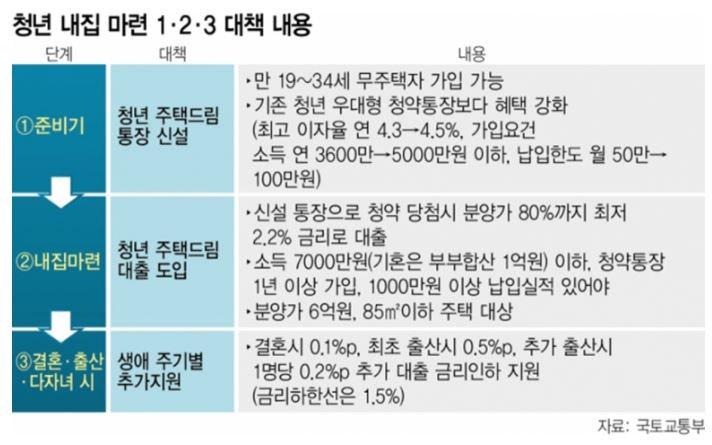 현행 청년 우대형 청약통장 대비 완화된 가입요건(소득 3600만 원 → 5000만 원, 무주택 세대주 →무주택자), 높은 이자율(최대 4.3 → 4.5%)과 납입한도(최대 50만 → 100만 원)를 적용한다.