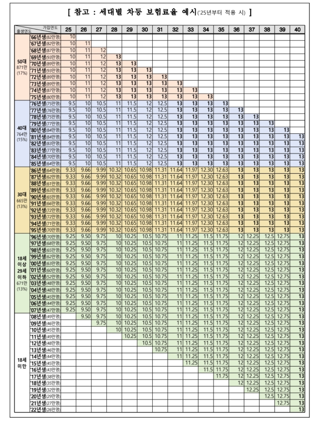 보험료율을 13%로 인상할 때, 2025년에 50대인 가입자는 매년 1% p, 40대 0.5% p, 30대 0.33% p, 20대는 0.25% p씩 인상하는 것을 주요 내용으로 한다.