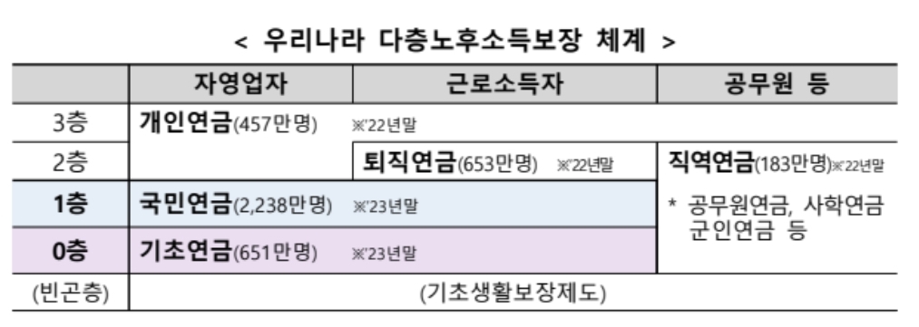 셋째, 국민·기초·퇴직·개인연금 등 다층 연금제도를 통해 국민들의 안정적인 노후소득을 보장한다.