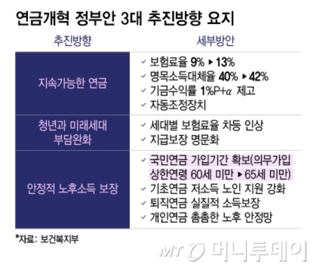 현재 60세 미만인 의무가 입상한 연령 조정도 추진한다. 다만, 의무가입 연령 조정은 고령자 계속고용 여건 개선 등과 병행해 장기적으로 논의하겠다는 방침이다.
