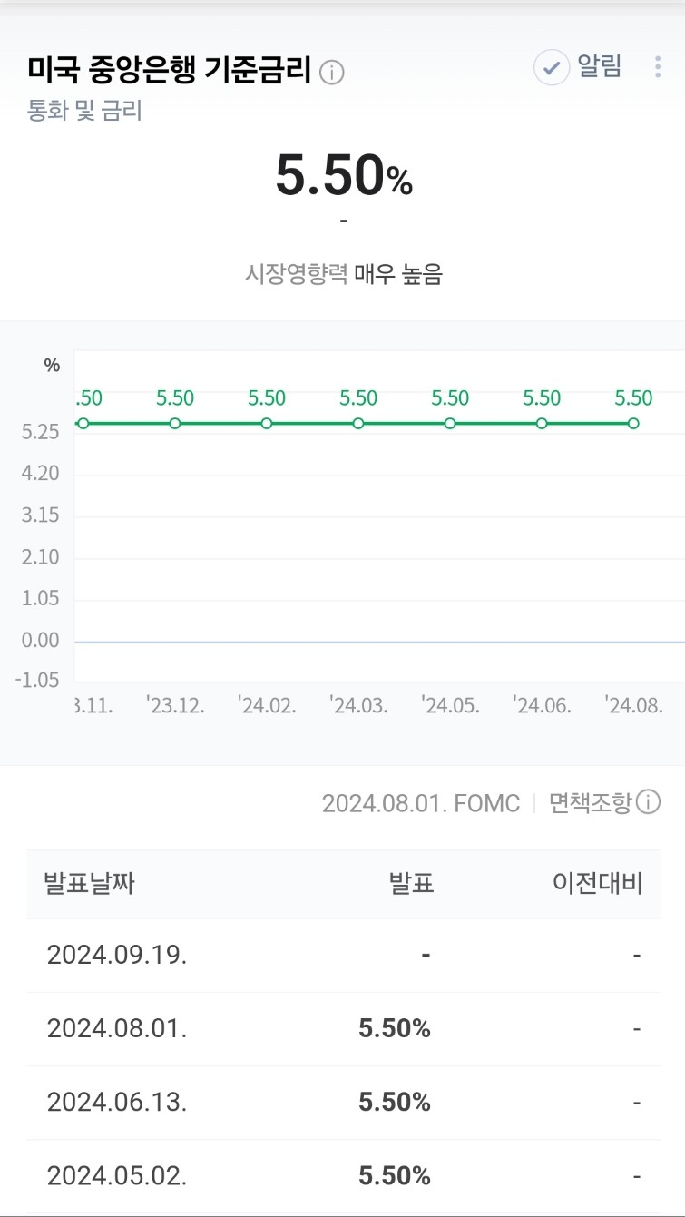 미국 정책금리는 지난해 9월부터 올해 7월까지 8회 연속 동결됐지만, 7월 FOMC 당시 제롬 파월 연준 의장이 "인플레이션이 기대 경로에 맞춰 둔화하는 가운데, 금리인하가 9월 회의 때 테이블 위에 오를 수 있다"라고 예고한 바 있다.