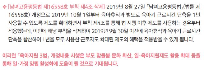 ** 현행: 육아휴직 중 75% 지급, 25%는 복직 후 6개월 이상 계속 근무 시 사후 지급